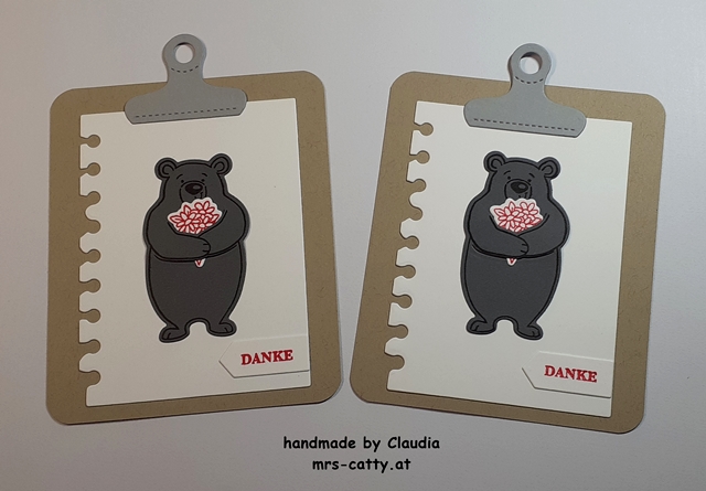 Die Kärtchen, in der Form eines Klemmbretts, habe ich mit den Produktpaketen „Valentine Kisses“ und „Ein paar Zeilen“ (Auslaufprodukt) und dem Stempelset „Berührende Botschaften“ gestaltet.